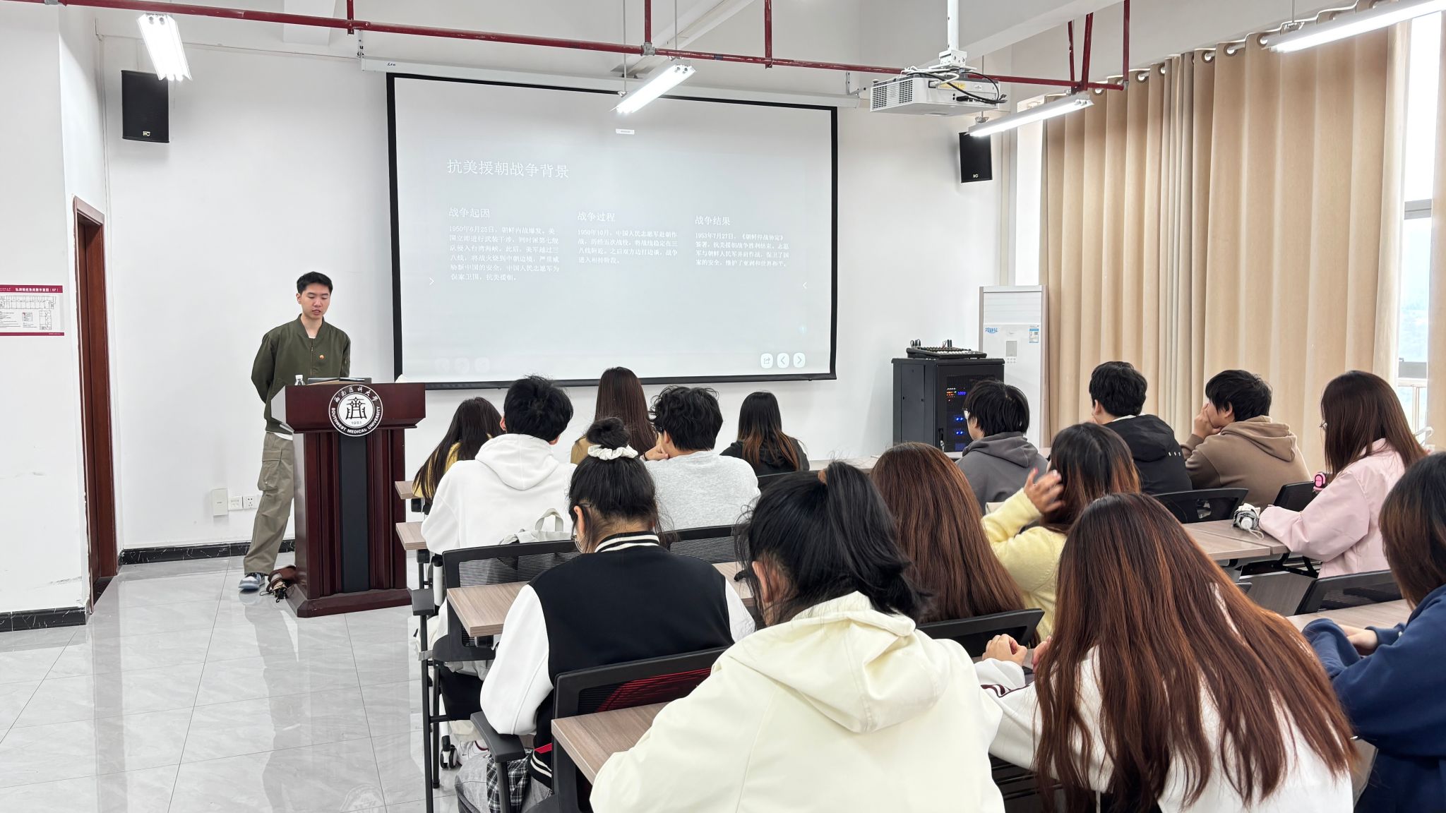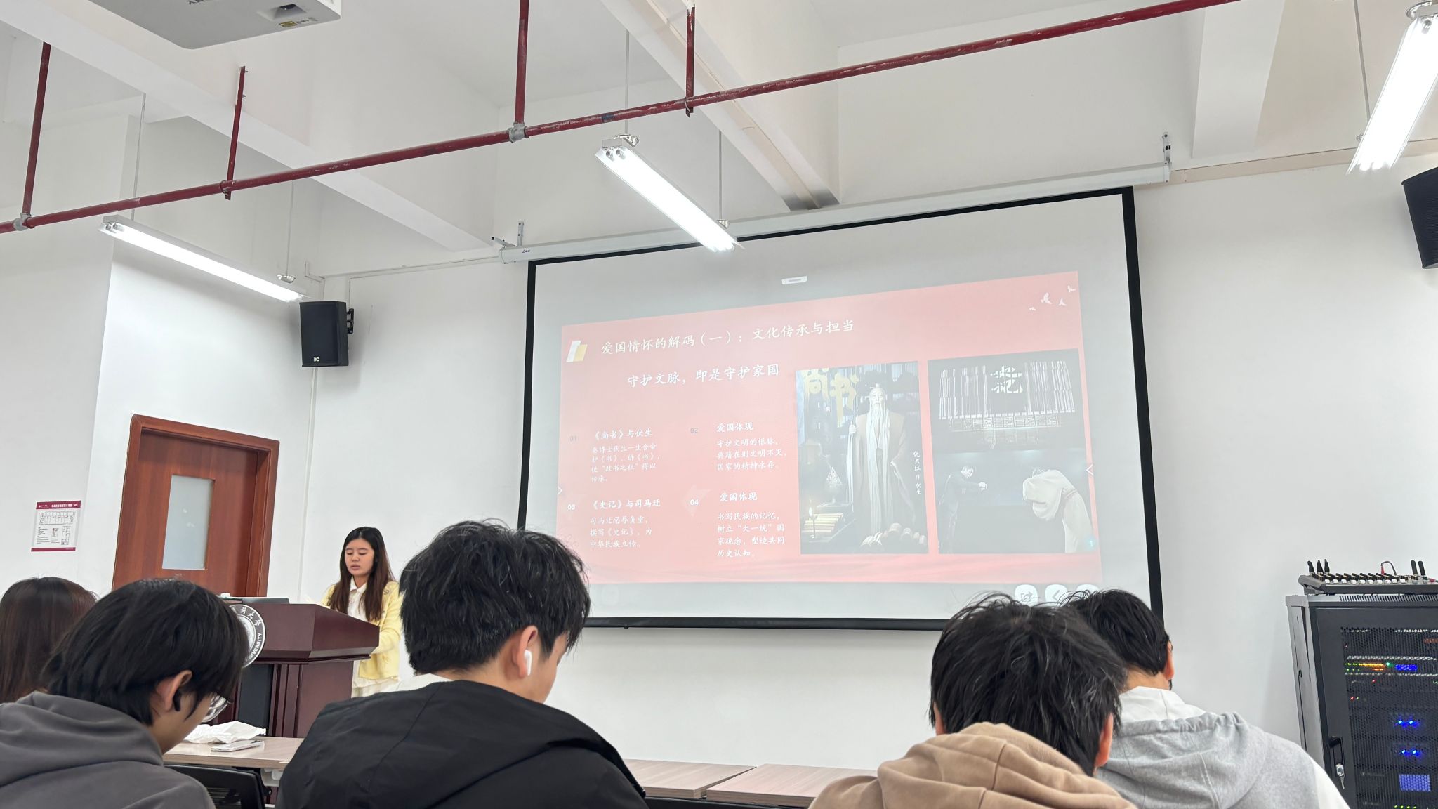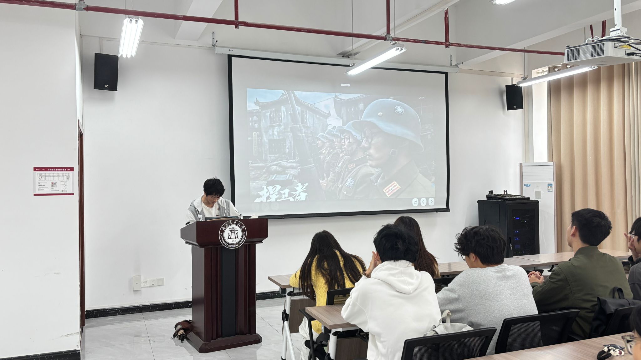 在接下来家国情怀分享会上,四位同学均以书为媒介进行了分享。彭文川同学以《金刚川》为核心,结合影片中志愿军战士在炮火中坚守桥梁的震撼情节,生动还原了抗美援朝战争中“向死而生”的英雄群像,让现场听众深刻体会到“哪有什么岁月静好,不过是有人负重前行”的深意;李金奎同学聚焦《宝山1937》,通过梳理淞沪会战中宝山保卫战的历史细节,讲述了将士们以血肉之躯抵御外敌的悲壮历程,带领大家重温那段刻骨铭心的民族抗争史;文凤遥同学则重温经典散文《谁是最可爱的人》,用真挚的语言再现志愿军战士的淳朴与勇敢,让“最可爱的人”这一称号在新时代依然闪耀着动人光芒;曾子洛同学分享《典籍里的中国》读书心得时,以“民为邦本”“自强不息”等典籍精神为切入点,展现了中华优秀传统文化中蕴含的家国情怀。讲述爱国故事,传递信仰力量,始终是该班不变的主旋律。