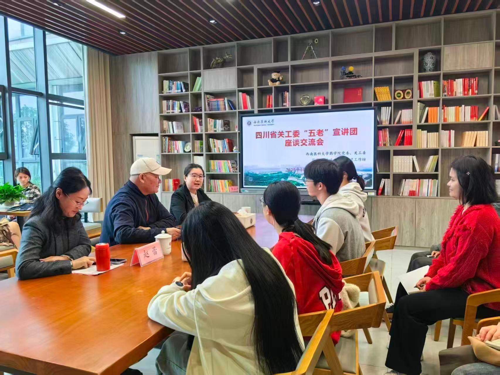10月25日上午,药学院在弘润楼127开展四川省关工委“五老宣讲团”座谈交流会,会议由四川省关工委“五老宣讲团”成员、西南医科大学关工委常务副主任、泸州市诗词学会会长尹杰霖书记主讲,药学院党委书记唐艳斌,党委副书记、纪委书记赵蕾,学生科副科长李云巧,以及来自药学院3个专业、4个年级的共26名学生代表参与。