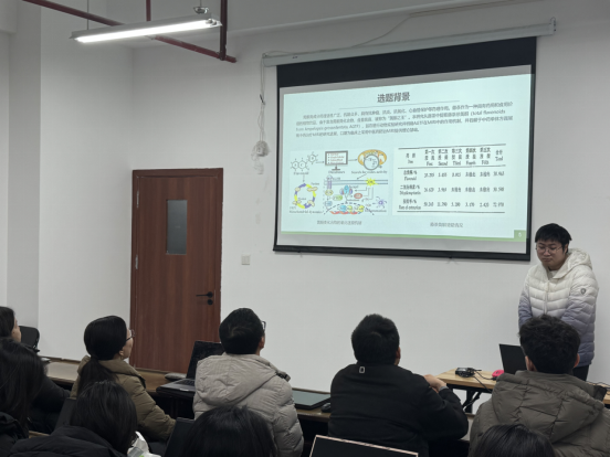 在“藤茶总黄酮对缺血再灌注损伤的药效物质评价”的汇报,答辩人详细介绍了藤茶含有丰富的黄酮类成分,对于治疗心肌缺血再灌注损伤的背景意义、研究内容及其技术路线等。答辩小组围绕潜在目标靶点的数量以及靶点的可行性展开提问,强调研究需兼顾社会效益与经济效益。