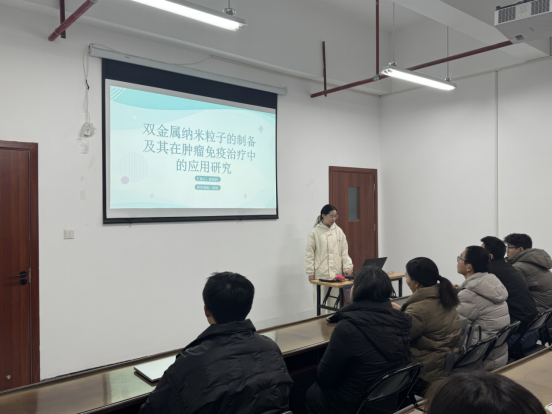 在“双金属纳米粒子的制备及其在肿瘤免疫治疗中的应用研究”的汇报,答辩人详细介绍了双金属纳米粒子对于胰腺癌免疫治疗的背景意义已经研究实施方案等。答辩小组围绕双金属纳米粒子中Mg²⁺和Mn²⁺的含量及应用安全性等关键环节展开提问,强调研究需兼顾创新性与临床应用安全性。