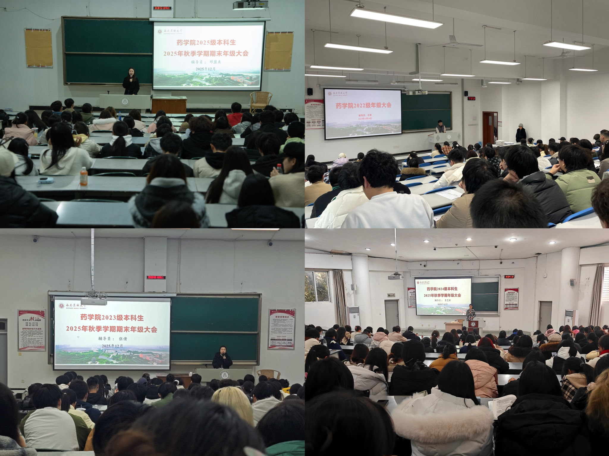 为进一步强化学生安全防范意识、严肃考风考纪,药学院于12月18日-24日,分年级组织召开了2022级-2025级本科生期末年级大会。学生科全体辅导员参会。会议围绕防范网络诈骗、期末诚信应考、第二课堂学分要求及寒假安全教育等主题展开,为同学们送上期末“安全锦囊”与“成长指南”。