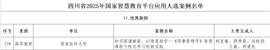 近日,四川省教育厅发布《关于2025年国家智慧教育平台应用案例评选结果的通知》,我校药学院柯发敏教师团队的《知识图谱赋能,AI情景助学—〈药事管理学〉智慧课程个性化学习创新实践》案例,成功入选高等教育类优秀案例。