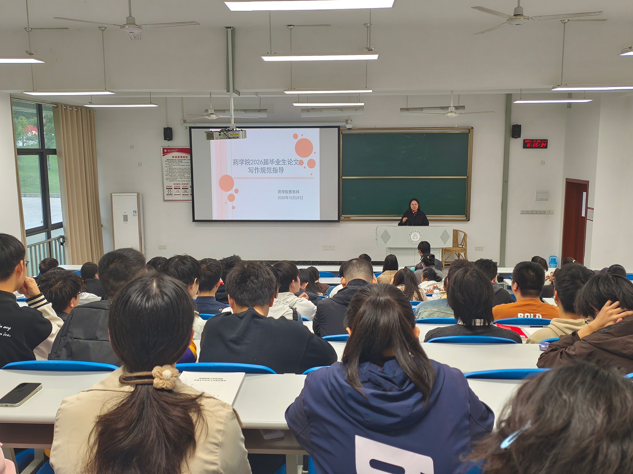 为系统规范本科生毕业论文工作、切实保障论文质量,2025年10月29日,药学院在城北校区学海楼203教室面向2022级药学、中药学专业学生举办专题讲座,教务科敖佐金老师担任主讲。