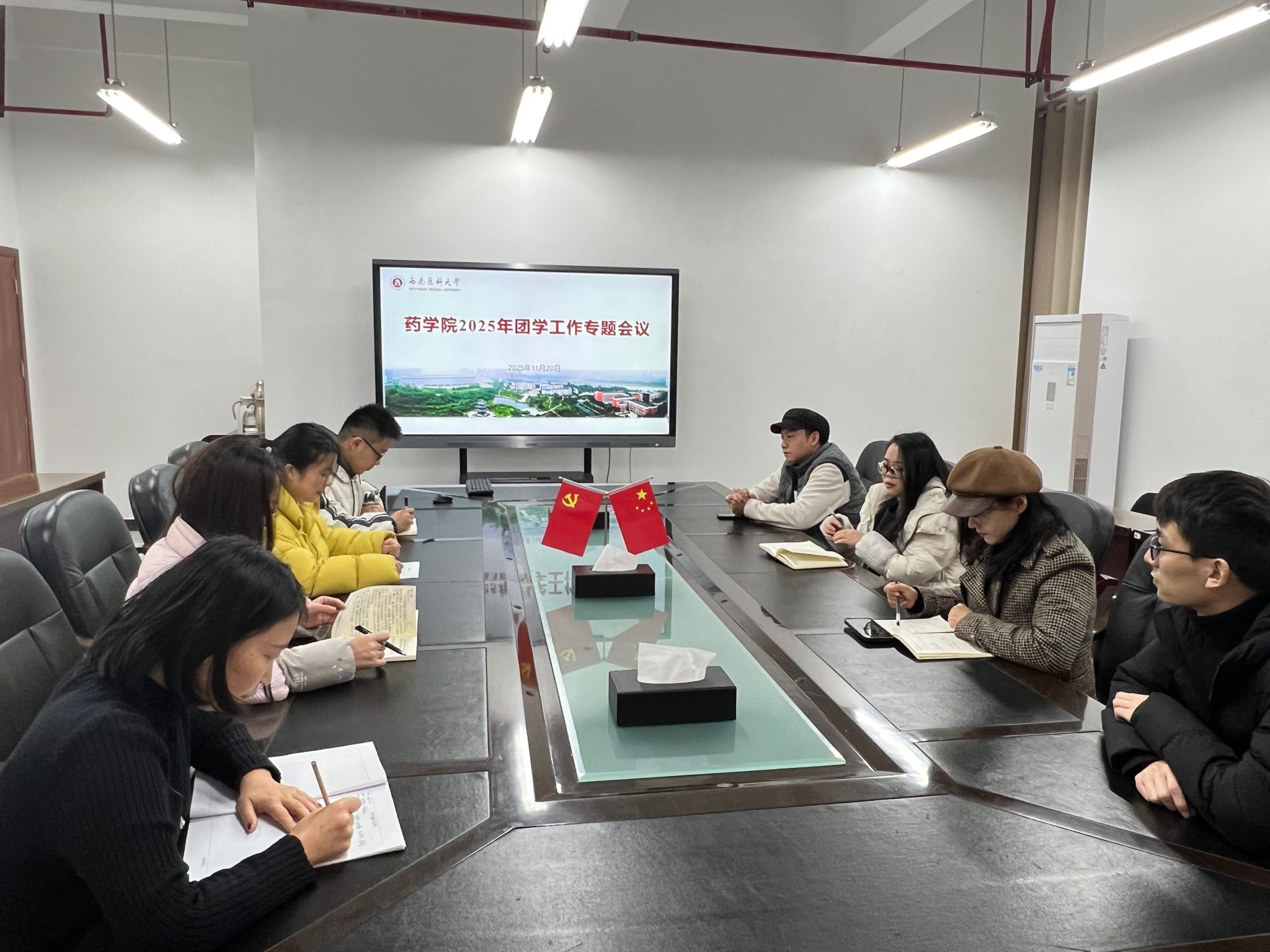 11月20日,药学院在弘润楼333会议室召开2025年团学工作专题会议,围绕思想政治引领、基础团务规范、社会实践深化、学生会改革等核心任务,研究部署下一阶段重点工作,推动团学工作高质量发展。学院党委副书记赵蕾、学科建设办主任王芳、学生科副科长李云巧、团总支书记邓盟来以及学生科全体辅导员和学生代表参会。本次专题会议由李云巧主持。